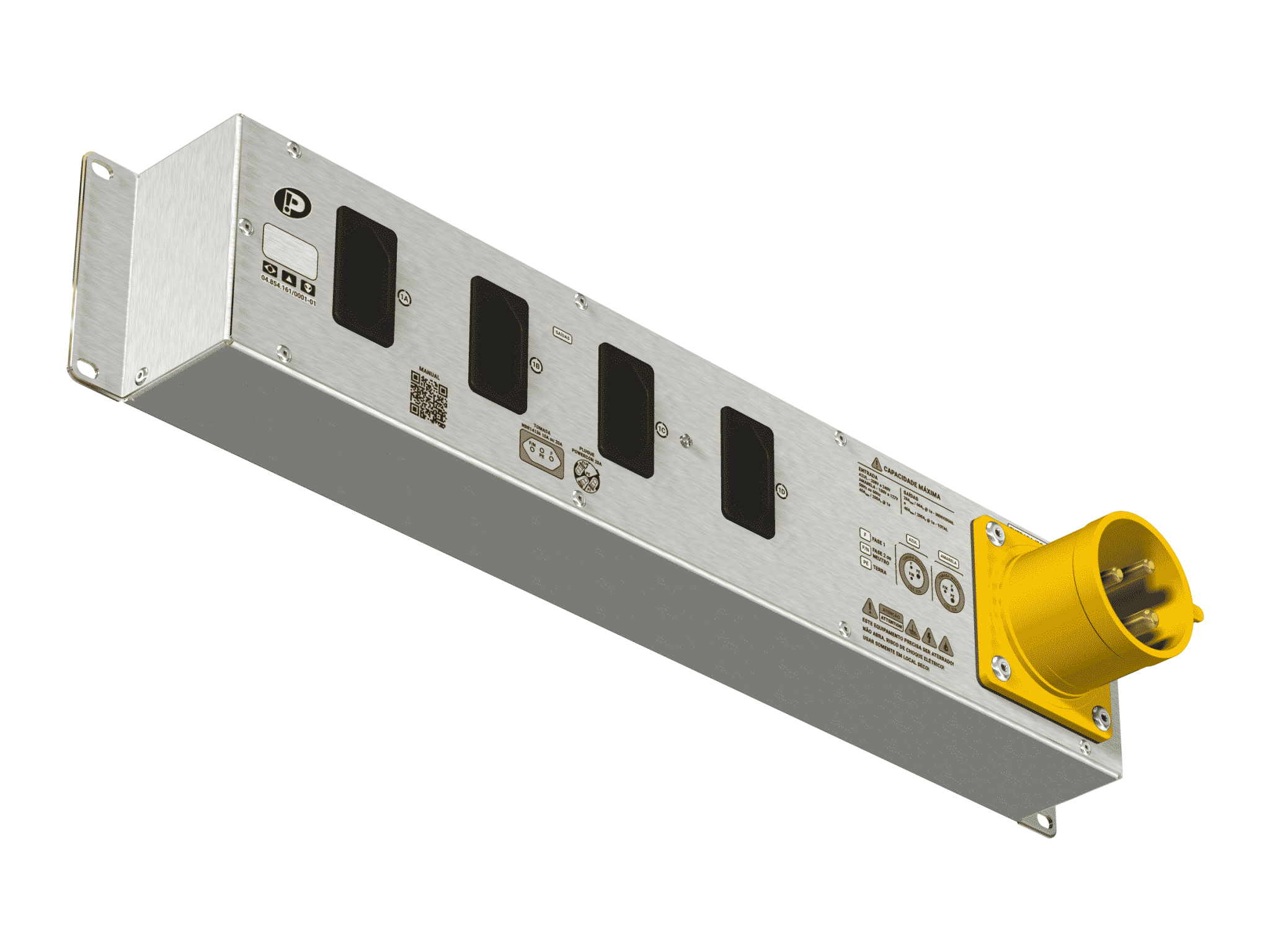 - Possui 4 saídas NBR-14136, 20A, 3 polos, com capacidade individual de 20A contínuos e até 60A de pico por 1s.