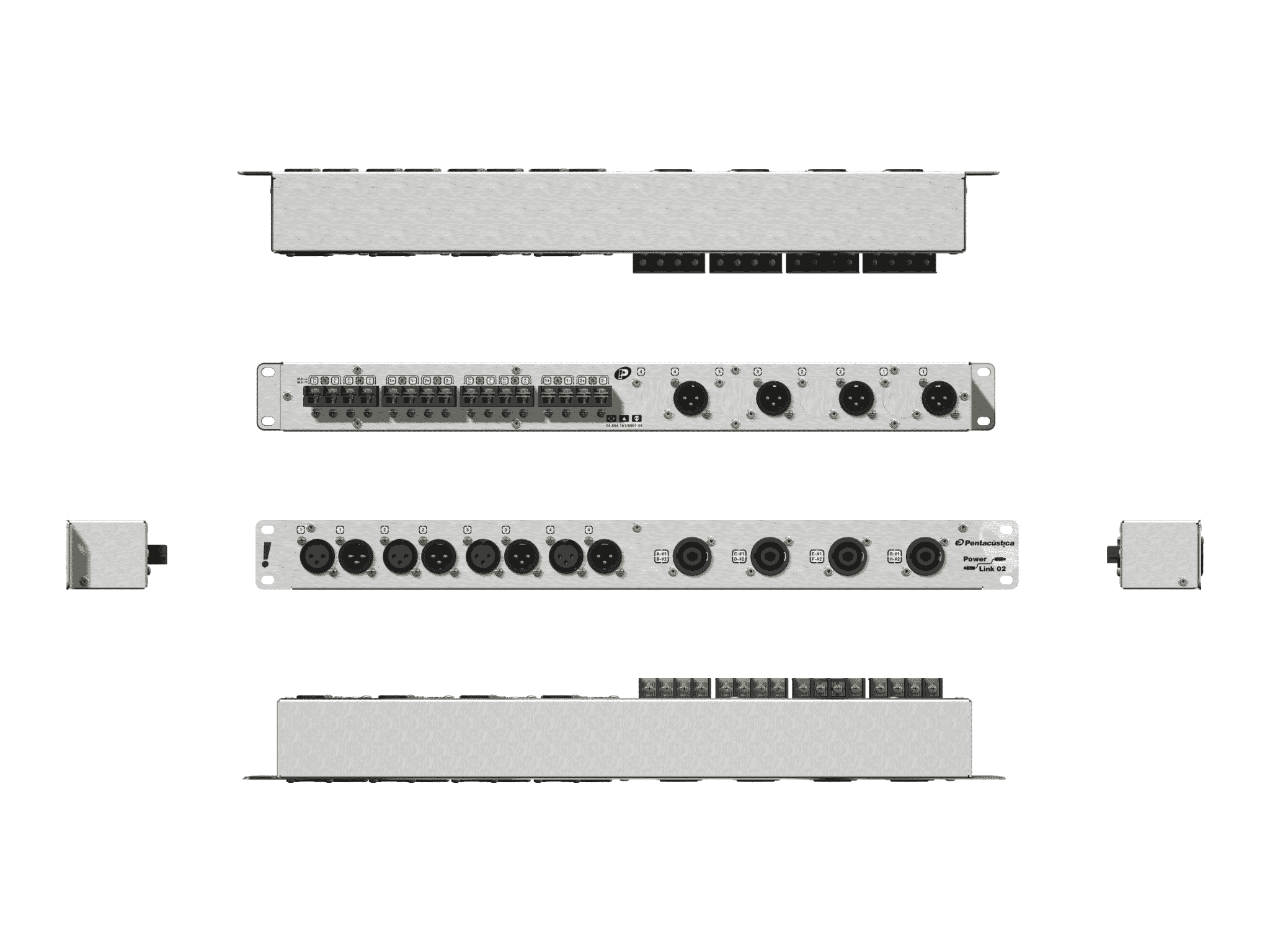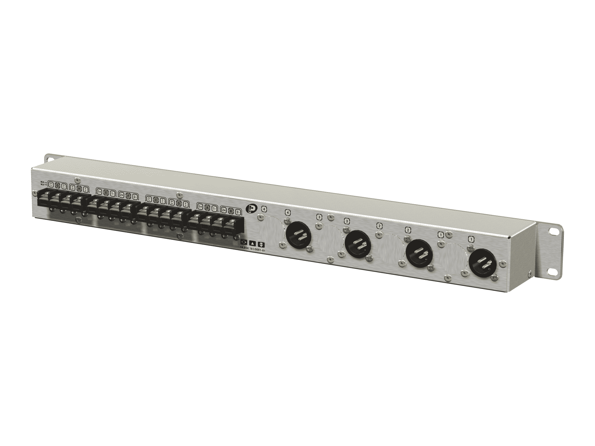 - 4 canais independentes para sinais de linha com conexões XLR-3: Entrada e link frontais e uma saída traseira.