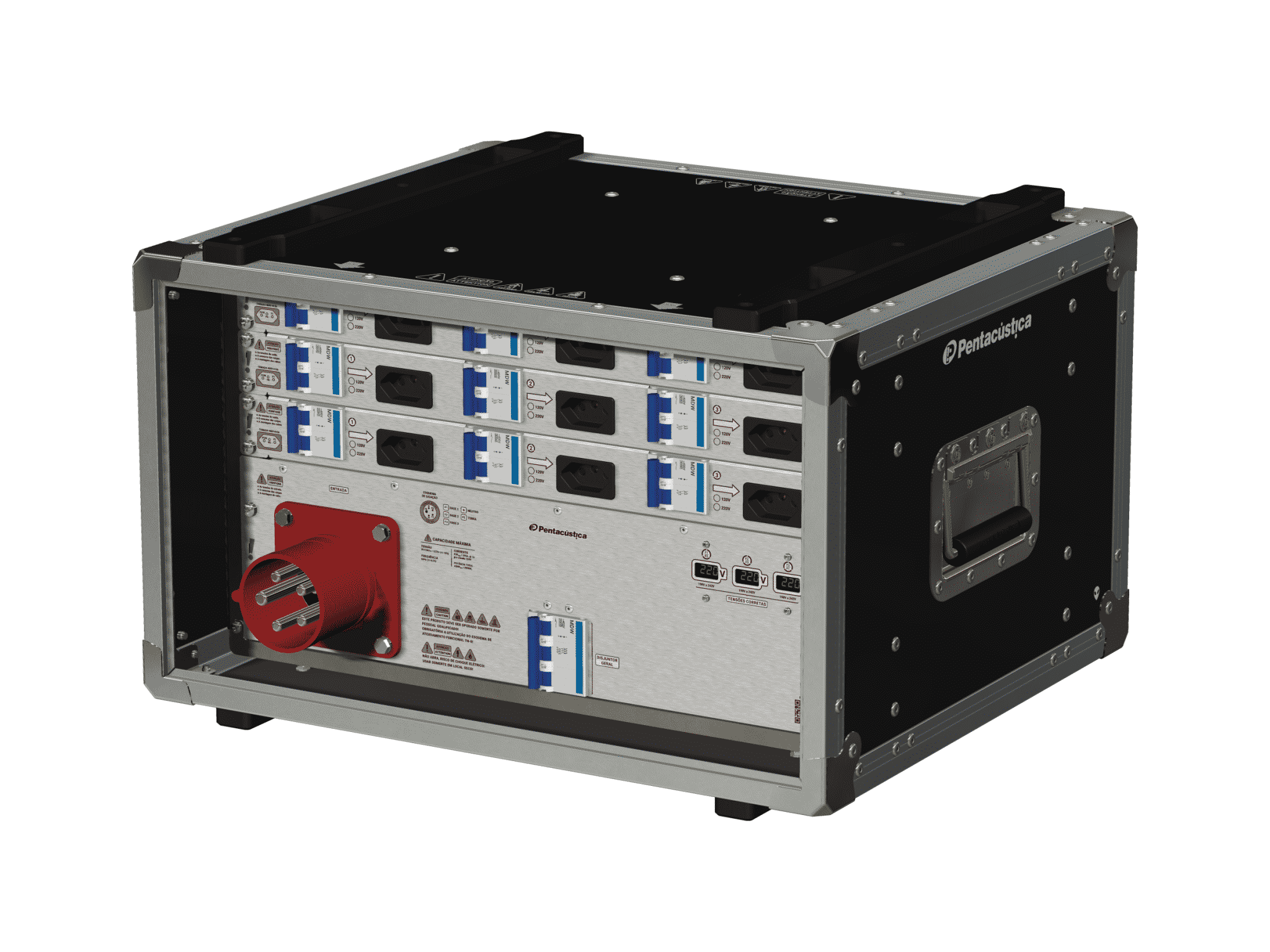 - Saídas 220V: 6x CEE-32A, fêmea, 3 polos, azul protegidas por disjuntores individuais 40A/C e 6x Powercon-20A protegidas por disjuntores individuais 20A/C.