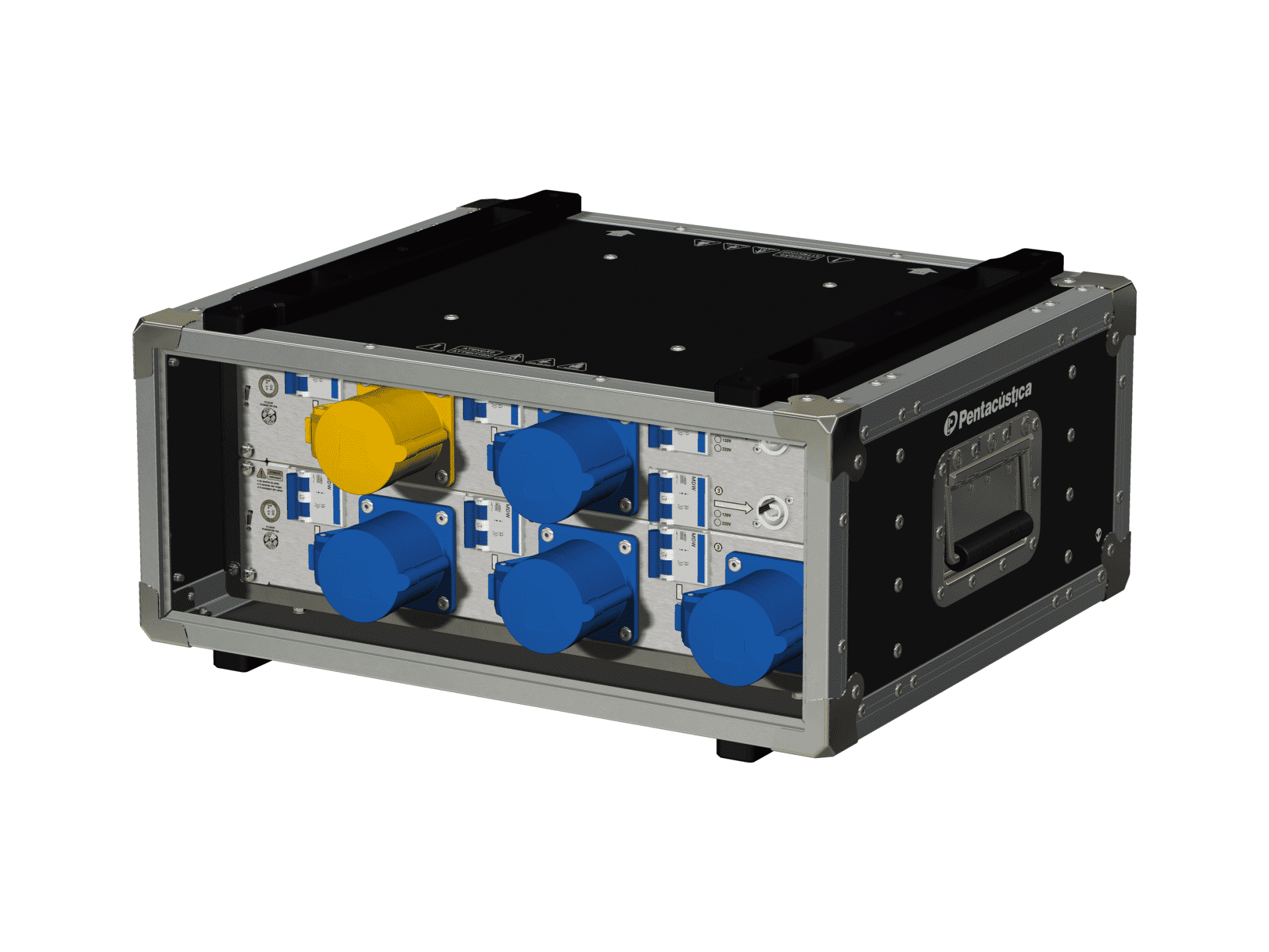 - Saídas 220V: 4x CEE-32A, fêmea, 3 polos, azul protegidas por disjuntores individuais 40A/C e 2x Powercon-20A protegidas por disjuntores individuais 20A/C