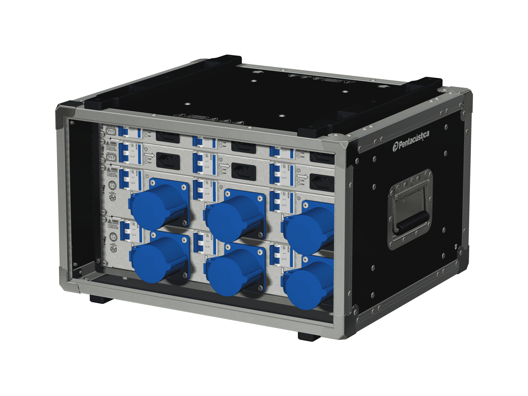 - Saídas 220V: 6x NBR-20A protegidas por disjuntores individuais 20A/C e 6x CEE-32A, fêmea, 3 polos, azul protegidas por disjuntores individuais 40A/C.
