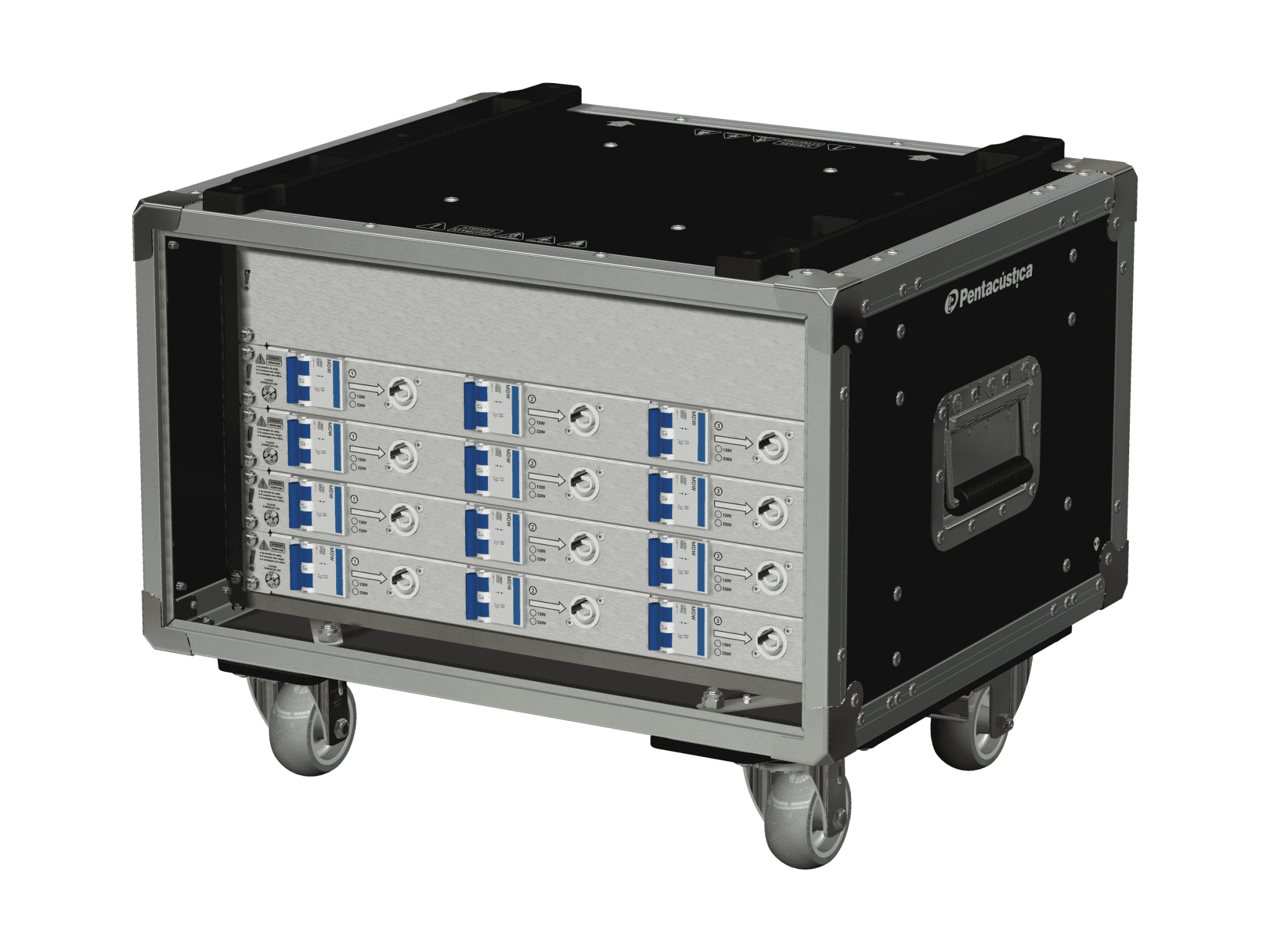- Saídas 220V: 12x Powercon-20A protegidas por disjuntores individuais 20A/C.