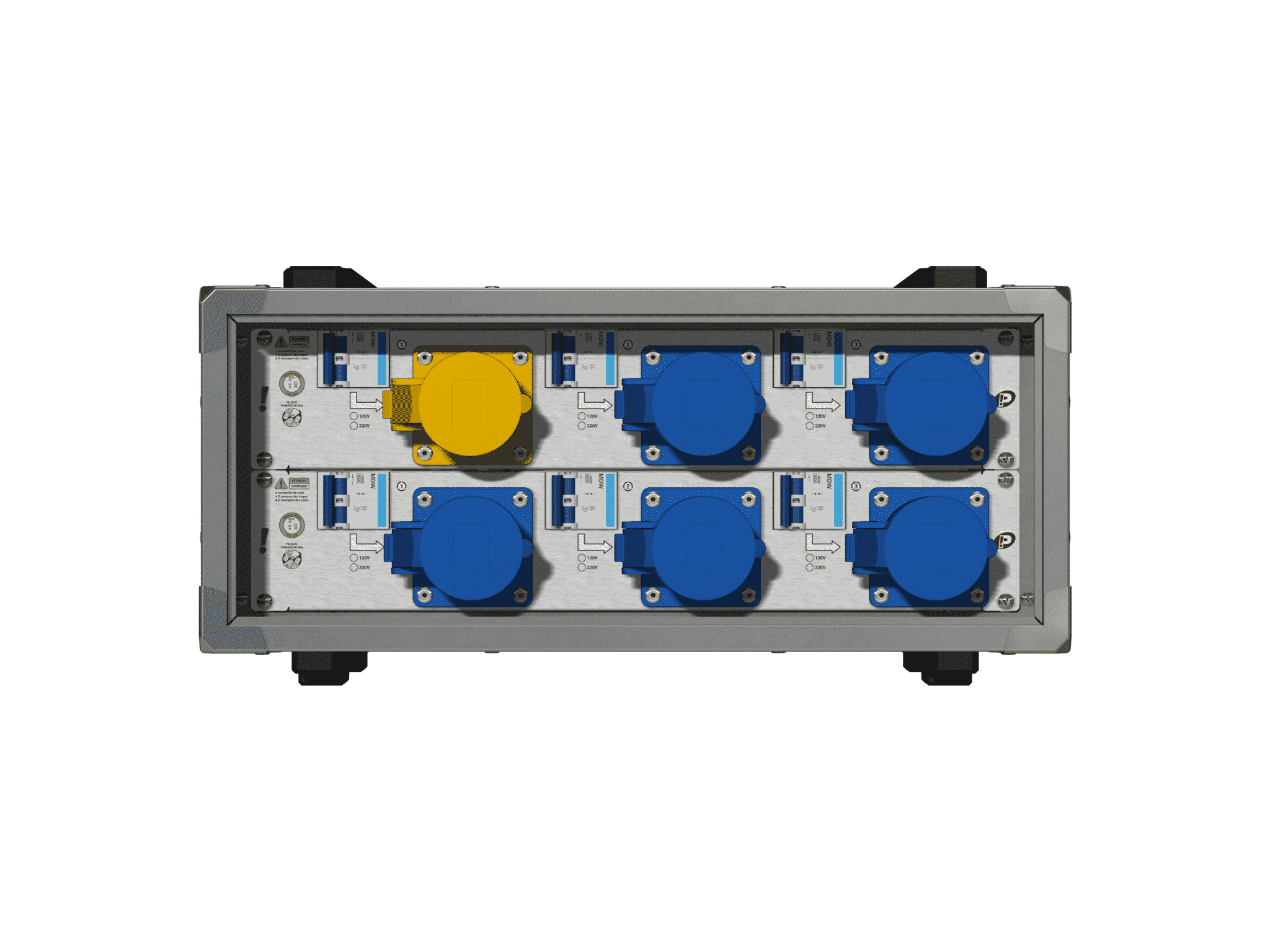 - Saídas 120V: 3x Powercon-20A protegidas por disjuntores individuais 10A/B e 1x CEE-32A, fêmea, 3 polos, amarela protegida por disjuntor individual 16A/C.