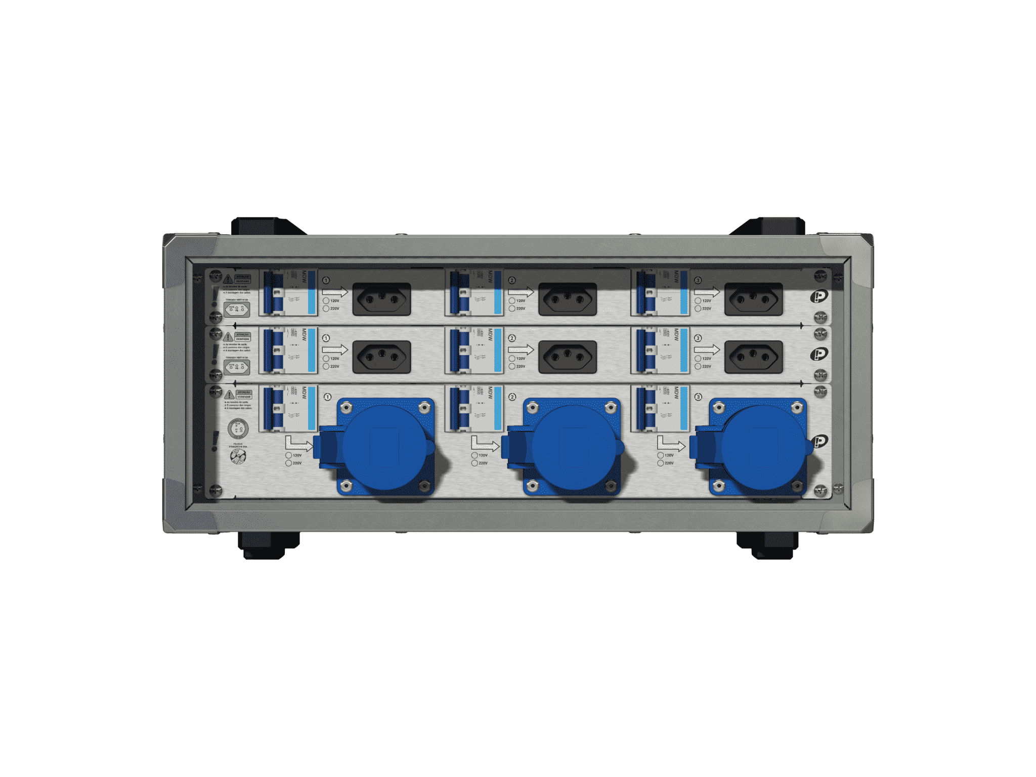 - Saídas 220V: 6x NBR-20A protegidas por disjuntores individuais 20A/C e 3x CEE-32A, fêmea, 3 polos, azul protegidas por disjuntores individuais 40A/C.