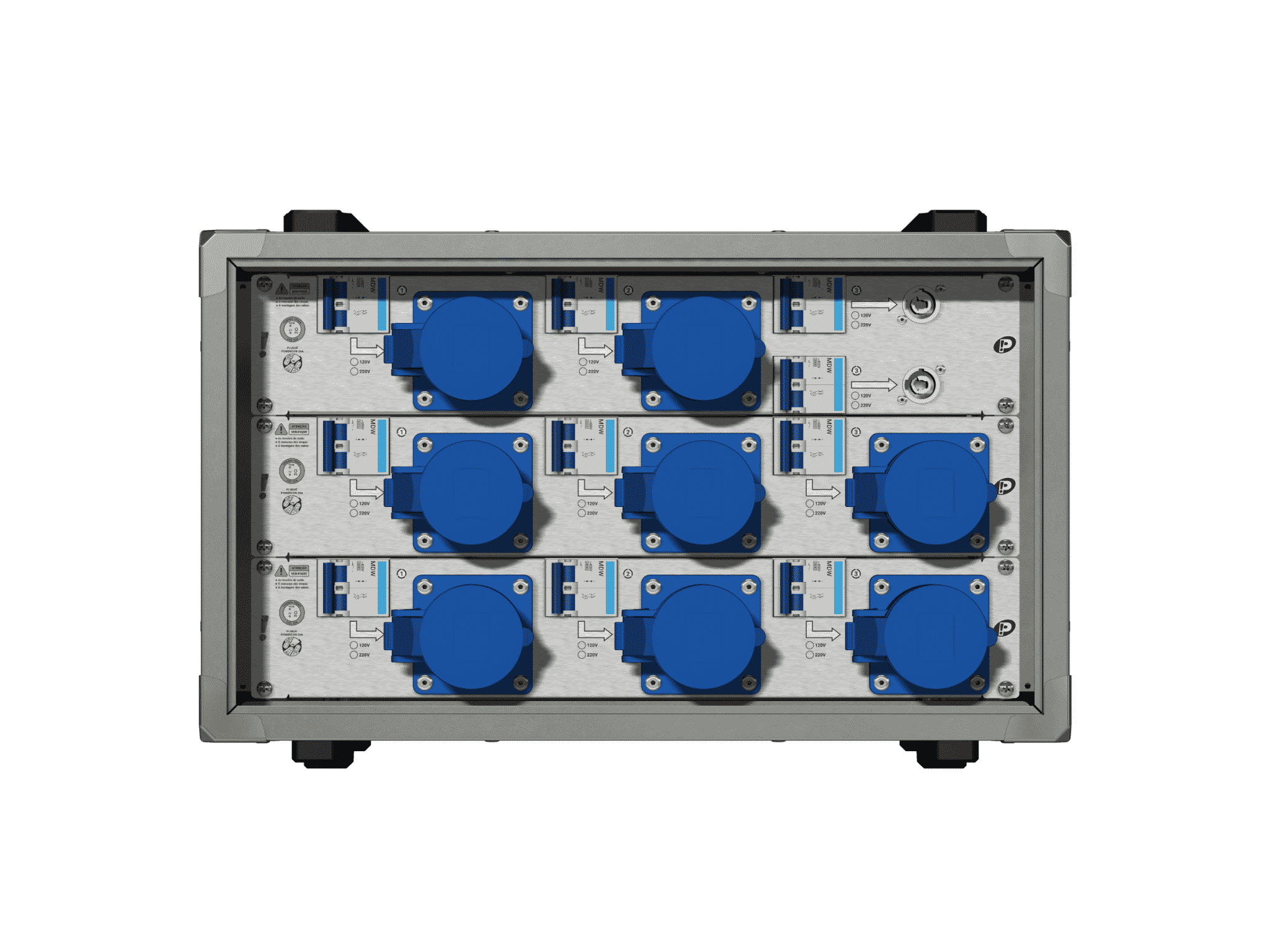 - Saídas 220V: 2x Powercon-20A protegidas por disjuntores individuais 20A/C e 8x CEE-32A, fêmea, 3 polos, azul protegidas por disjuntores individuais 40A/C.