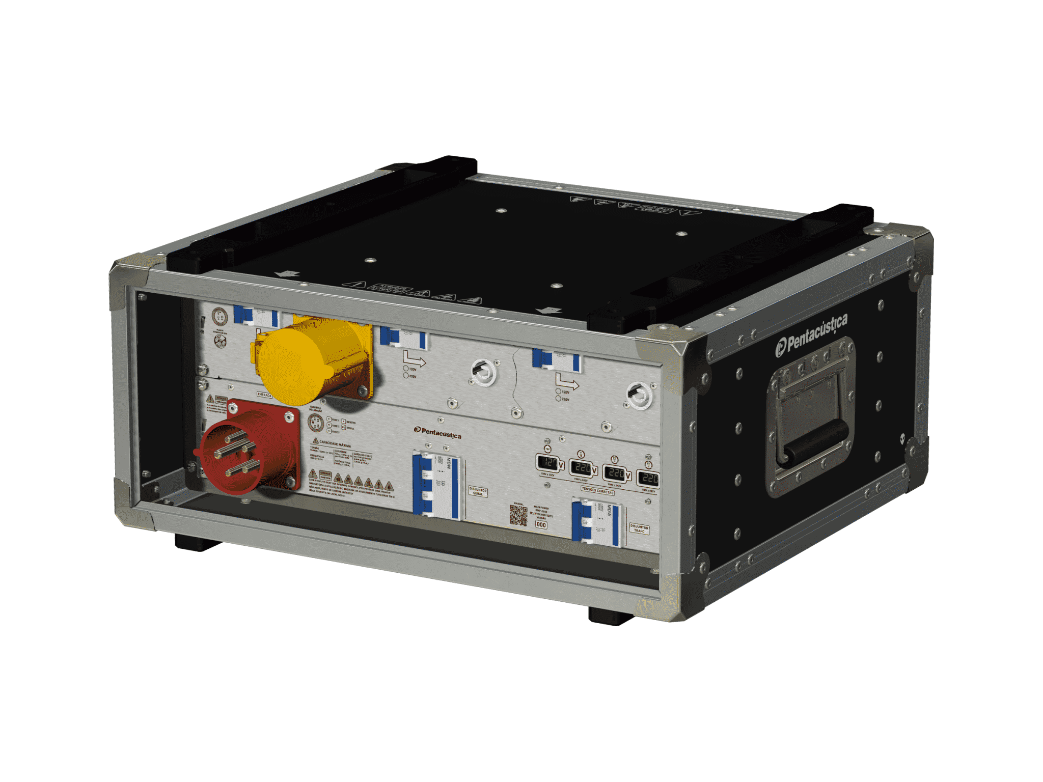 - Gabinete: Hard Case CPT-4x2P, fabricado com materiais compostos, 4U de altura, tampas flat e apoios em plástico industrial. Isolação Classe I e grau de proteção IP-2X.